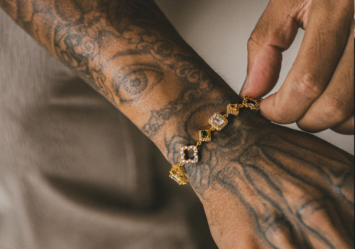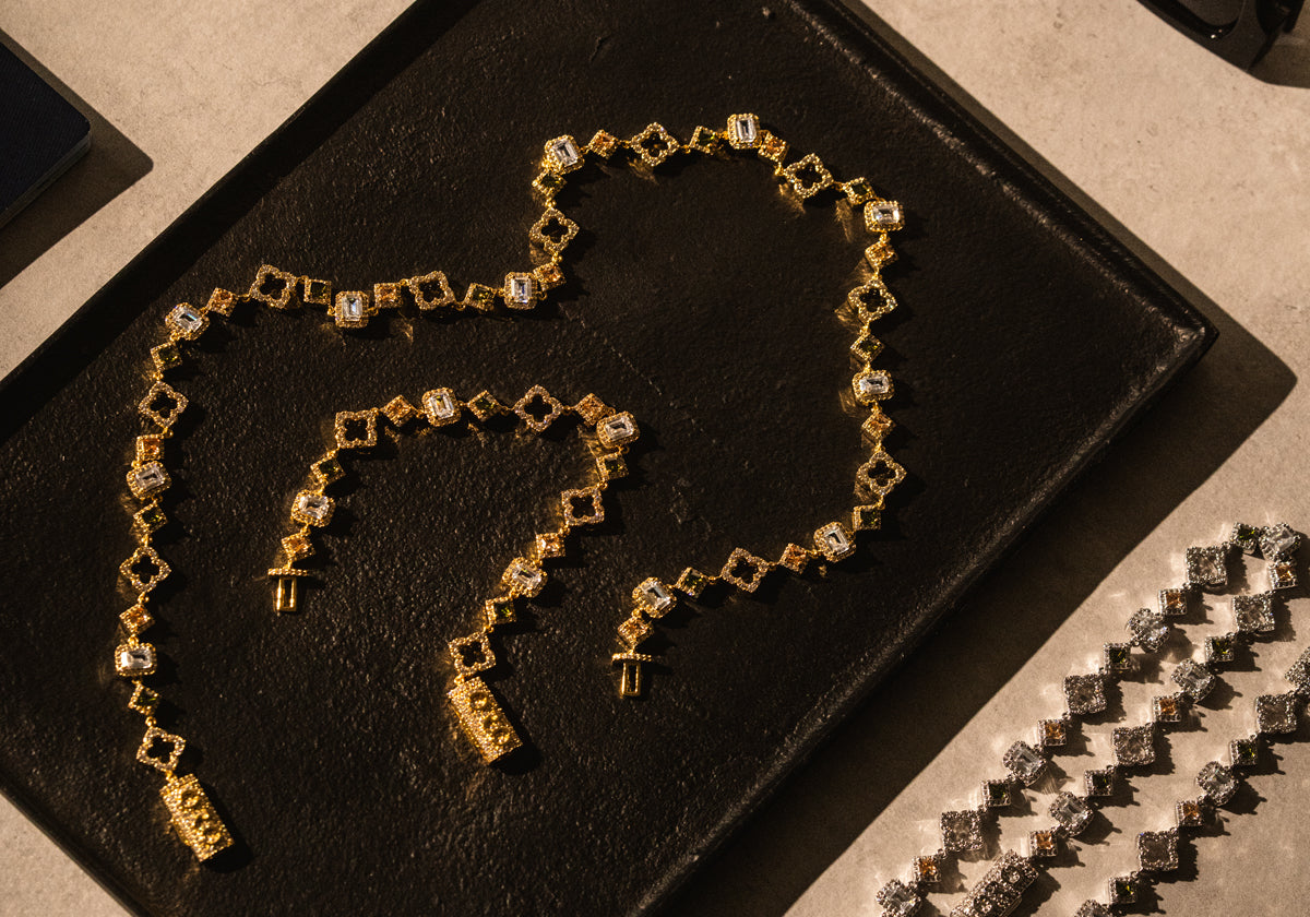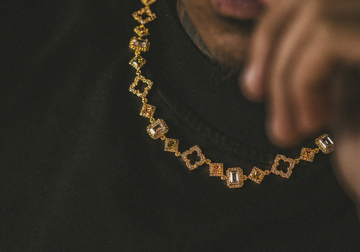 The Midas Gemstone draws inspiration from the legendary King Midas, embodying a legacy of wealth and abundance. Featuring distinctive clover motifs—a symbol of luck and prosperity—this piece is accented with vibrant emerald and champagne stones, centered around a striking emerald-cut white diamond simulant. Each gem is meticulously set to catch the light from every angle, making it a true standout in luxury and style. Finished with our signature high-end ORO clasp and a durable finish, it’s designed to turn heads.