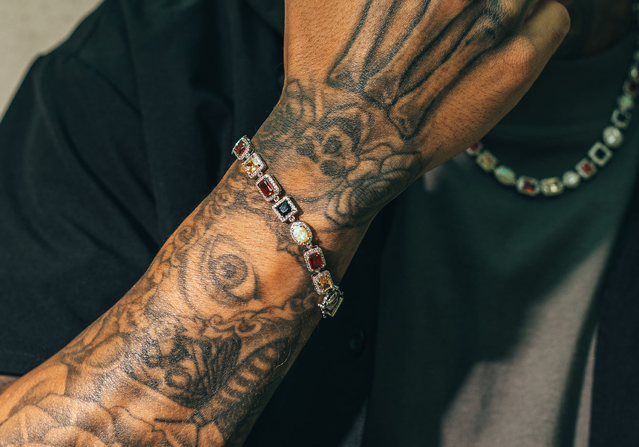 A standout piece, the Royal Gemstone Bracelet symbolizes exclusivity and power. Featuring majestic simulated amber, ruby, white diamonds and black diamonds perfectly tied together with fire opals, this piece channels the stately aura and commanding presence of the bold. A masterpiece fit for a king.