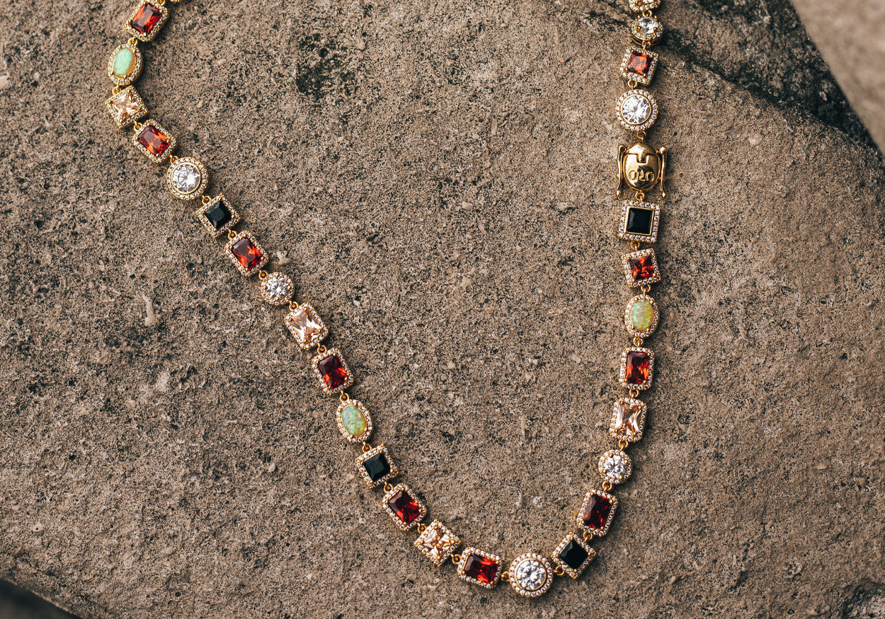 A standout set, the Royal Gemstone Set symbolizes exclusivity and power. Featuring majestic simulated amber, ruby, white diamonds and black diamonds perfectly tied together with fire opals, these pieces channel the stately aura and commanding presence of the bold. Masterpieces fit for a king.
